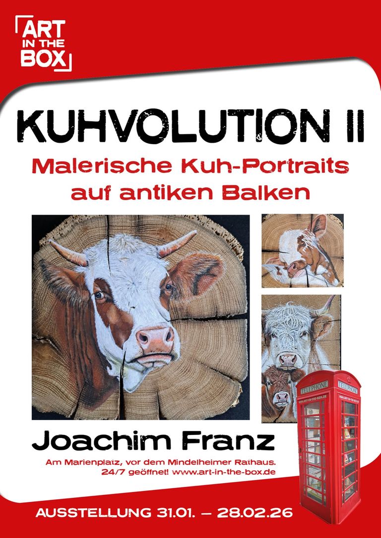 Mit großer Freude präsentieren wir die zweite Einzelausstellung von Joachim Franz bei Art in The Box. Nach der begeisterten Resonanz auf seine Premiere ist der Allgäuer Künstler in den vergangenen Monaten erneut gewachsen – künstlerisch wie öffentlich. Der Filmbeitrag des Bayerischen Rundfunks „Ein Künstler aus dem Allgäu findet seinen Stil: Kühe mit Charakter“ hat ihn einem breiteren Publikum vorgestellt und bestätigt, was Besucher seiner ersten Ausstellung längst gespürt haben: Franz hat einen unverwechselbaren Stil gefunden.