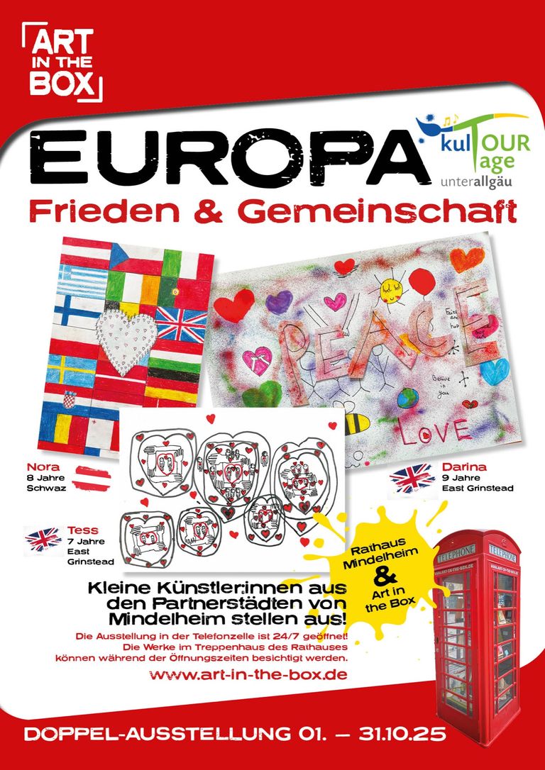 Vom 1. bis 31. Oktober 2025 verwandelt sich die rote Kunst-Telefonzelle „Art in the Box“ in der Maximilianstraße in Mindelheim erneut in einen besonderen Ausstellungsraum. Unter dem Titel „Europa, Frieden und Gemeinschaft“ werden dort kreative Arbeiten von Kindern und Jugendlichen im Alter von 8 bis 16 Jahren gezeigt – gestaltet von jungen Künstlerinnen und Künstlern aus Mindelheim und den Partnerstädten East Grinstaed (Großbritannien), Sant Feliu de Guíxols (Spanien) und Schwaz (Österreich).
