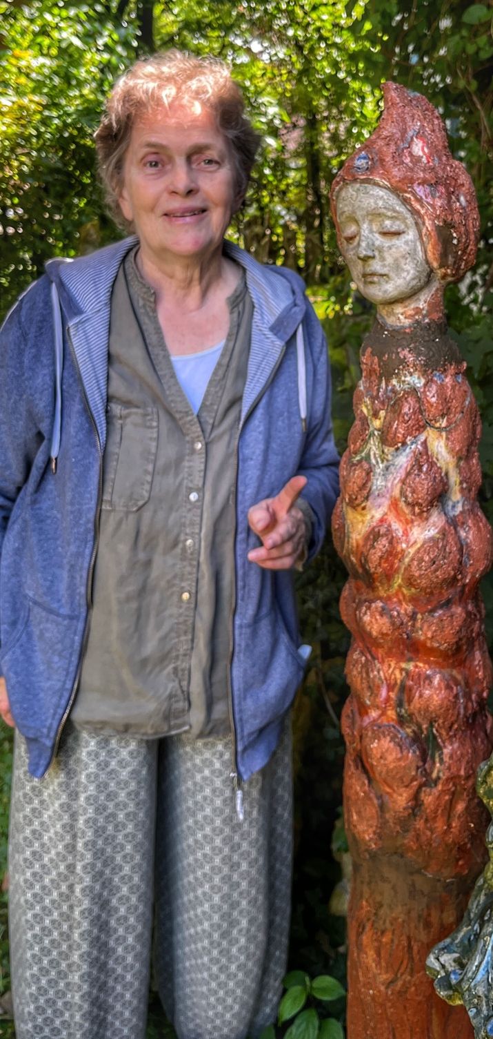Monika Dacic ist keine klassische Ausstellerin, die Künstlerin möchte gefunden werden. Große öffentliche Präsentationen waren in ihrem Leben rar. Eine der wenigen fand vor rund 20 Jahren im alten Mesnerhaus in Mindelheim statt – einem Ort, dessen morbider Charme mit ihren Skulpturen und Bildern auf geheimnisvolle Weise harmonierte. Wer sich heute auf den Weg zu ihrem Atelier im Mindelweg 2 macht, entdeckt eine märchenhafte Welt, die in ihrer Fülle fast überwältigt. Der Garten wird bevölkert von fast lebensgroßen Keramikfiguren – Elfen, Derwischen und Engeln – als wären sie gerade einer anderen Dimension entstiegen.