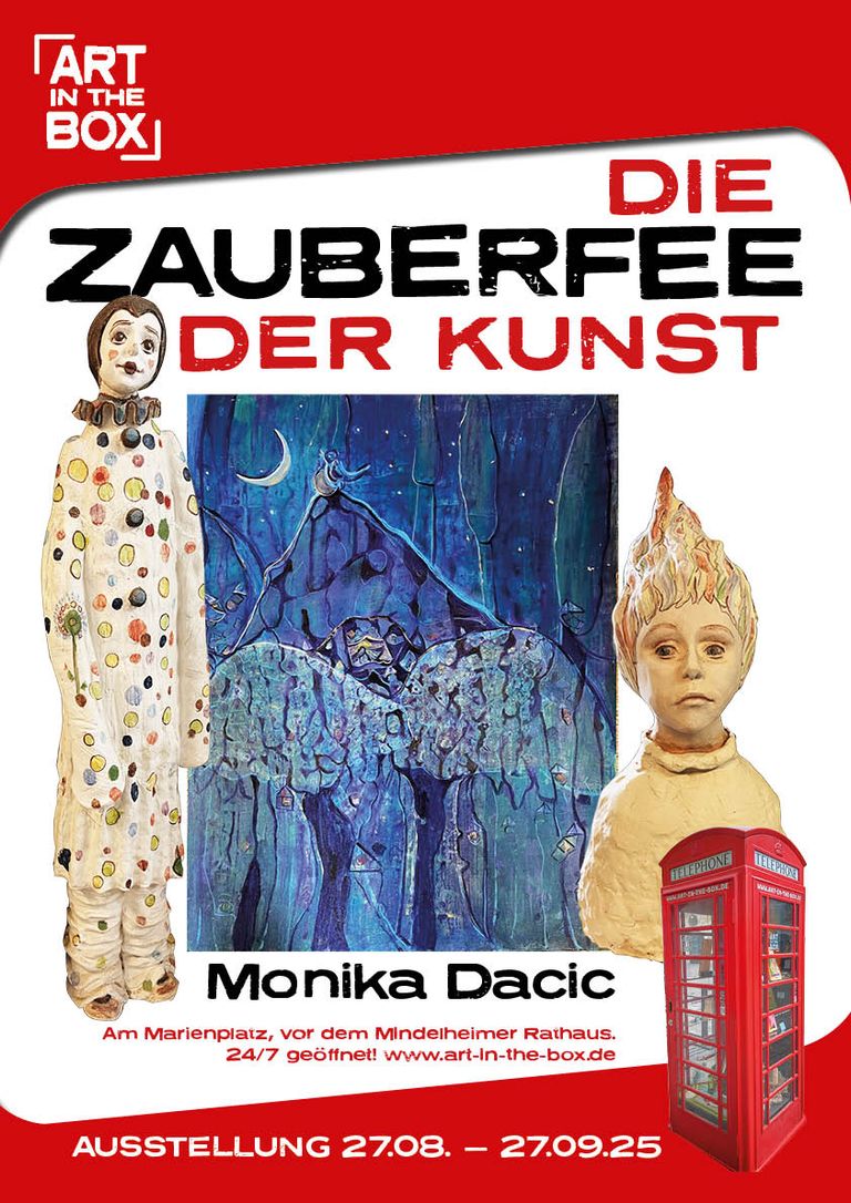 Für die aktuelle Ausstellung in der Telefonzellen-Galerie „Art in the Box“ wurden einige Skulpturen aus dem Dornröschenschlaf geholt und nach Mindelheim gebracht. Die großformatigen Gemälde passen zwar nicht in die kleine Zelle, aber Frank Grabowski hat einige Werke fotografisch reproduziert und zeigt diese als Fenster in Dacics Welt. Die rund um die Uhr zugängliche Ausstellung bietet damit einen faszinierenden Einblick in ein außergewöhnliches künstlerisches Schaffen.